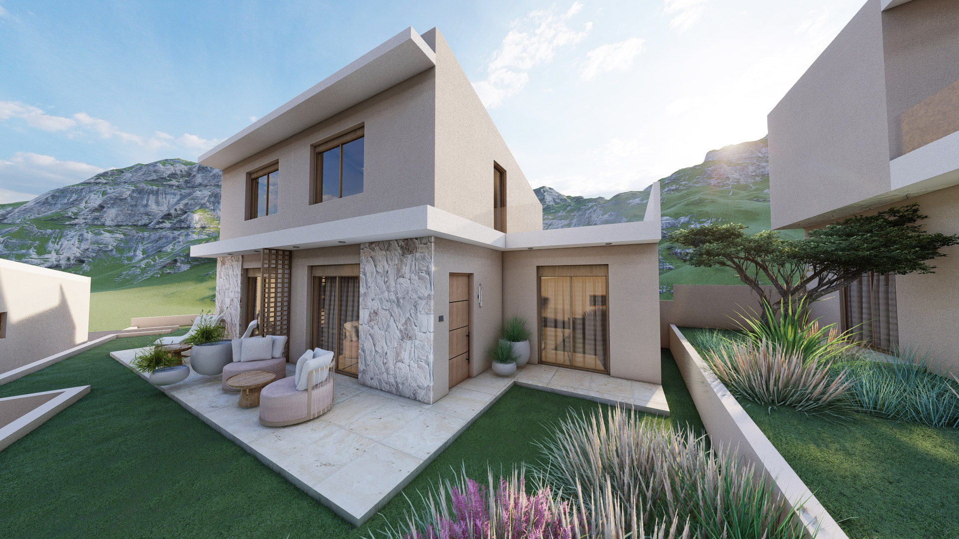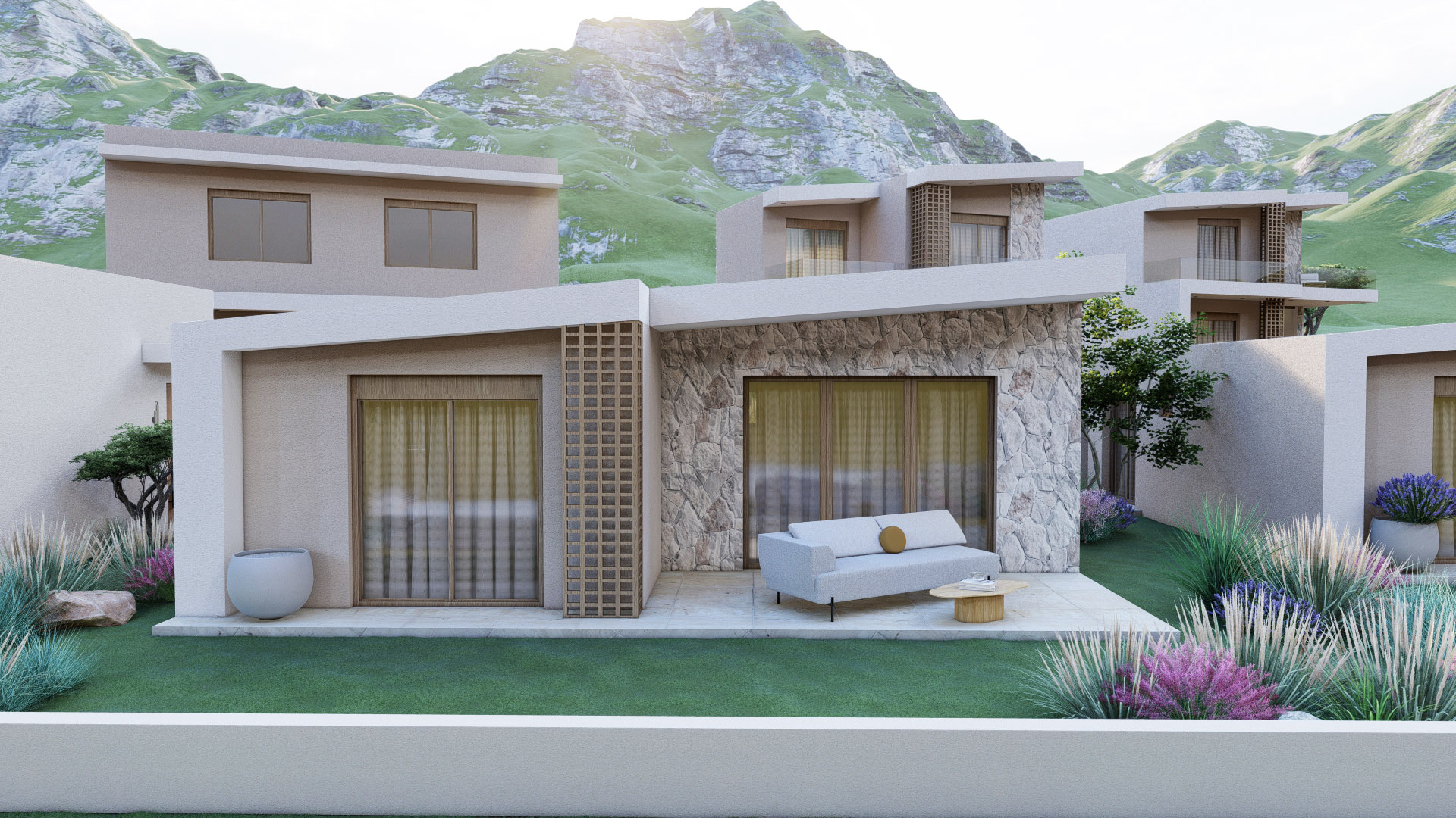 Οι κατοικίες διαθέτουν μοντέρνα αρχιτεκτονική γραμμή, ευρύχωρες διαρρυθμίσεις και φωτεινούς εσωτερικούς χώρους που ανοίγονται σε ιδιωτικές αυλές ή μπαλκόνια με πανοραμική θέα στο Αιγαίο. Ορισμένες βίλες προσφέρουν και ιδιωτική πισίνα, προσδίδοντας μια αίσθηση αποκλειστικότητας και ιδιωτικότητας. Κάθε λεπτομέρεια έχει σχεδιαστεί με γνώμονα την ποιότητα: ενεργειακά κουφώματα, θερμομόνωση, προεγκατάσταση για κλιματισμό, δυνατότητα τοποθέτησης τζακιού και παροχές που εξασφαλίζουν άνεση σε κάθε εποχή.