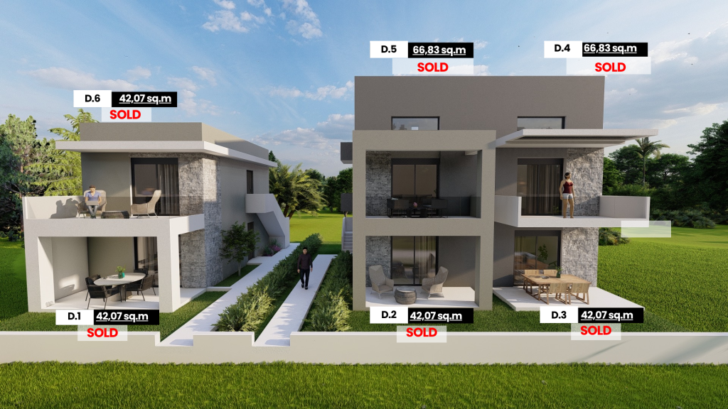 Κάθε διαμέρισμα διαθέτει ιδιωτικό κήπο και αποκλειστικό χώρο στάθμευσης, ενώ η σύγχρονη κατασκευή περιλαμβάνει ενεργειακά αποδοτικές λύσεις όπως ηλιοθερμικούς θερμοσίφωνες και προεγκατάσταση για αντλία θερμότητας και κλιματισμό.